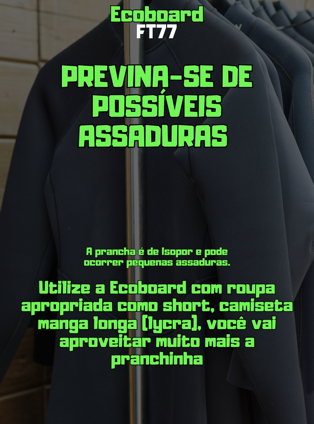 A Ecoboard FT77 foi criada e desenvolvida em conjunto com Filipe Toledo, Bicampeão Mundial de Surf, com o principal objetivo de facilitar o acesso a toda e qualquer pessoa que tenha interesse em ingressar no esporte. Seu design inovador auxilia crianças, adultos e principiantes a se divertir e evoluir com um baixo custo de aquisição. Diferente de uma prancha convencional ou SoftBoards, a Ecoboard FT77 vem para reforçar esse cuidado com a natureza sendo a primeira prancha de surf no mundo sendo 100% reciclável! Ela não passa por nenhum processo de laminação ou resina, por ser 100% EPS, não absorve água e é super resistente. Além de se divertir nas ondas, a Ecoboard FT77 permite a total interação do surfista com o produto final podendo pintar e estilizar seu próprio equipamento. Não fique fora dessa onda e garanta já sua Ecoboard Hurley para desfrutar das ondas com uma prancha totalmente inovadora e 100% ECOLÓGICA.